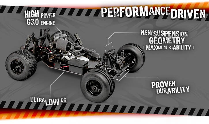 HPI thought of everything when it came to remaking the 2WD stadium truck. You get a huge power increase from a new, stronger pullstart G3.0 engine and an all-new chassis design to bring racing like performance to a rock solid entry level truck.