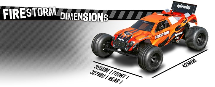 The Firestorm is as durable as it is nimble, giving you maximum enjoyment under any conditions! The aluminium main chassis and upper deck combine with the steel chassis brace to make the Firestorm extremely stiff. A dual-pad slipper clutch protects the drivetrain from rough landings, while the 0.8 module clutchbell and spur gear are designed for maximum efficiency and reliability. The transmission features a 4.11 to 1 ratio and a sealed planetary gear differential, allowing you to tune the performance of the truck with different diff oils. Stopping the Firestorm is a fibre disk brake actuated by easy to adjust linkage. The steel centre chassis brace provides extra stiffness and keeps the gear mesh between the spur and clutchbell consistent. Steel front axles and rear dogbones take the extreme punishment of bashing and racing in the worst possible environments. Protecting the electronics are sealed compartments for the battery pack and receiver, protecting them from the elements and strategically placed for optimum weight balance.