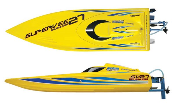 The SuperVee 27 was the first RTR brushless boat ever and has developed a reputation as a worthy FE class competitor. The SuperVee 27R builds on that foundation and adds 2.4GHz performance gear for even better performance. It also comes with a more powerful, water-cooled brushless motor for higher performance and exhilarating speeds, new water-cooled 45A ESC, new trim scheme, fiberglass hull and more. This sleek-looking offshore racer is completely assembled and ready for exciting racing action.