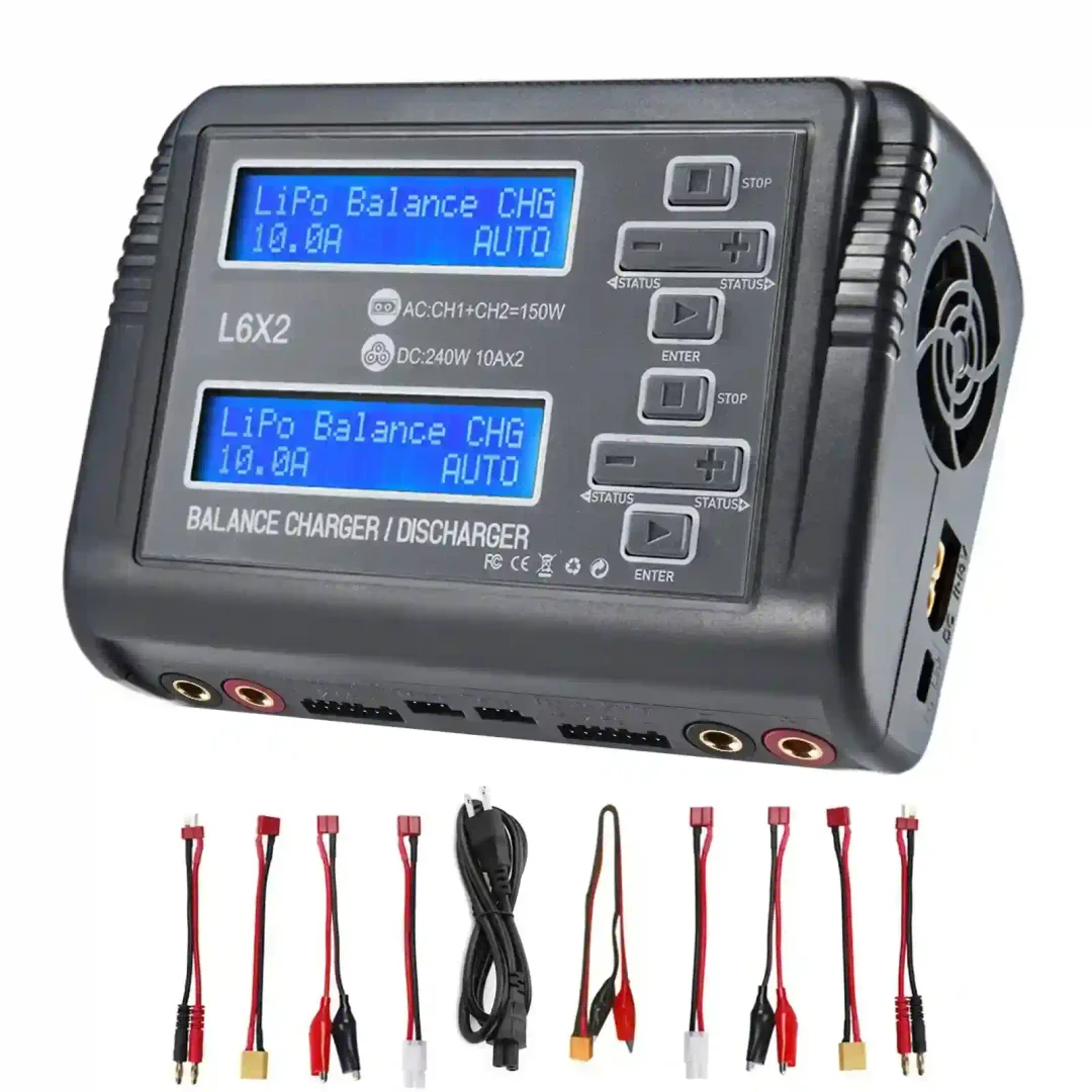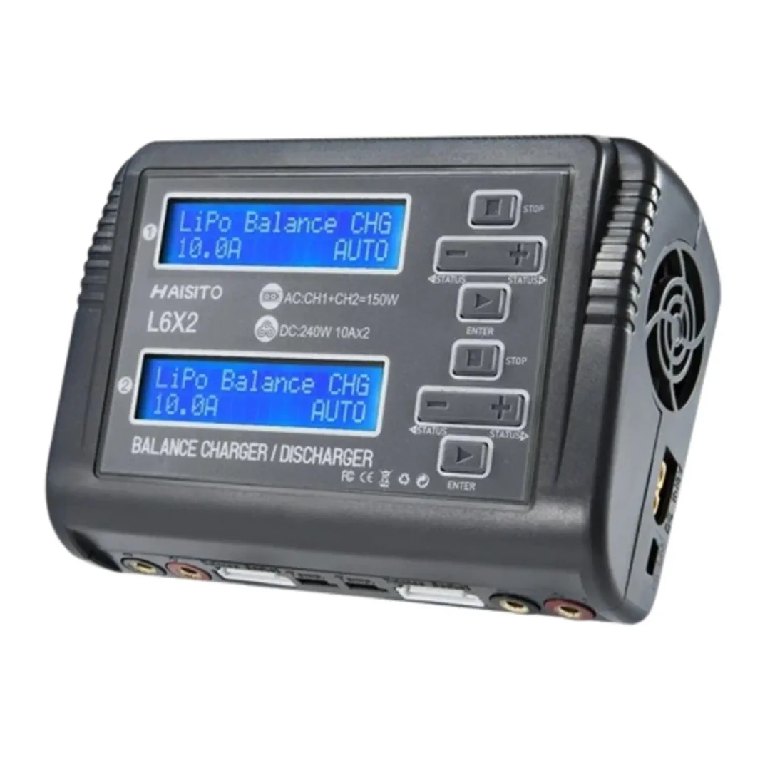 The HTRC L6X2 AC 150W DC 240W 10Ax2 Dual Channel Battery Charger is a high-performance, versatile charger designed for charging a variety of battery chemistries used in RC hobbyist applications, electric vehicles, drones, and other electronics. The charger supports dual-channel charging, allowing users to charge two batteries simultaneously, each with independent settings for current, voltage, and other parameters. With its ability to work with both AC and DC power sources and a high output current of up to 10A per channel, the HTRC L6X2 is perfect for charging a wide range of battery types, including LiPo, Li-ion, NiMH, NiCd, and Pb (Lead Acid). The charger is equipped with an LCD display to provide real-time data on the charging process, including voltage, current, capacity, and elapsed time.