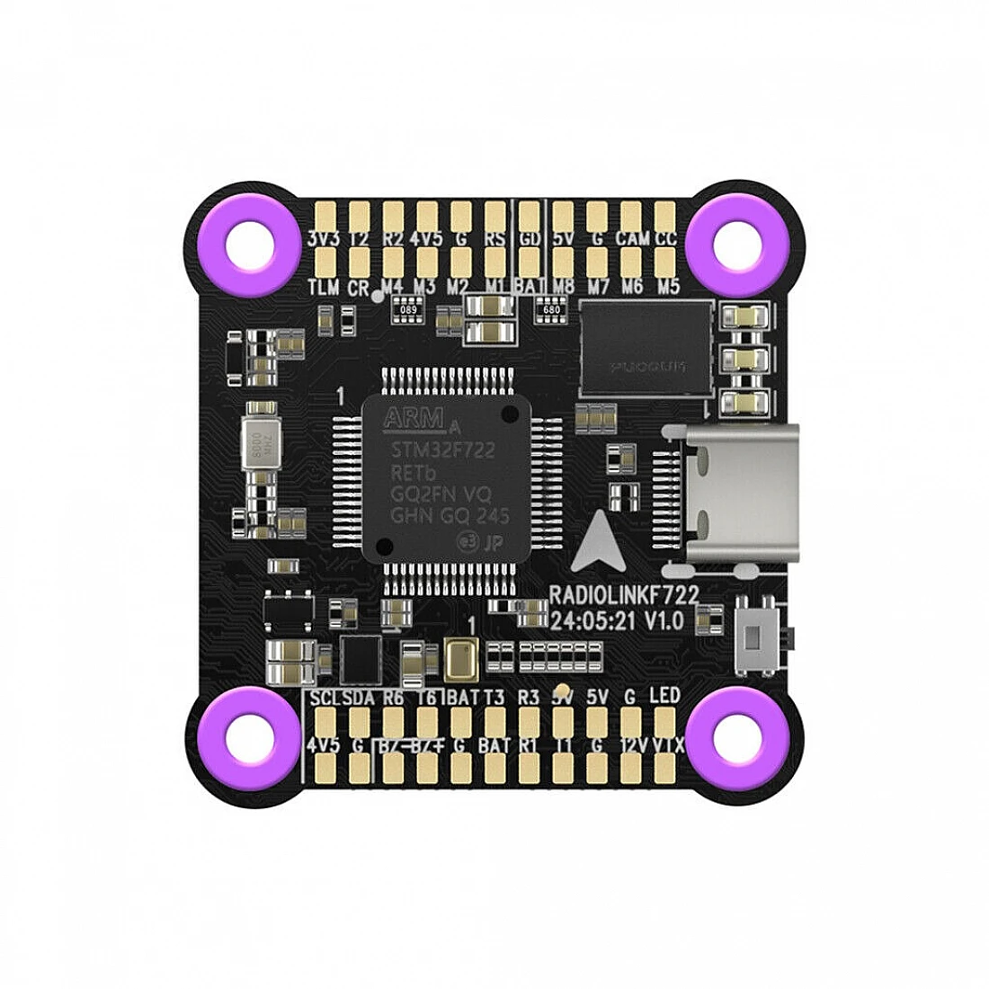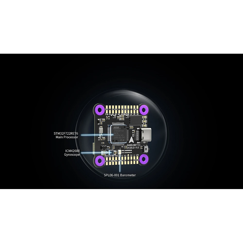 The Radiolink F722 Racing Flight Controller is a high-performance FC designed for FPV racing and freestyle drones. Powered by an STM32F722 processor, it delivers ultra-fast response times and precise flight control. It features a built-in OSD, blackbox logging, and supports Betaflight firmware for easy tuning. With 5 UART ports, it allows seamless integration of peripherals like GPS and receivers. The F722 includes a barometer and supports 2-6S LiPo batteries for versatile power options. Its durable, lightweight design ensures reliability in high-speed racing conditions.